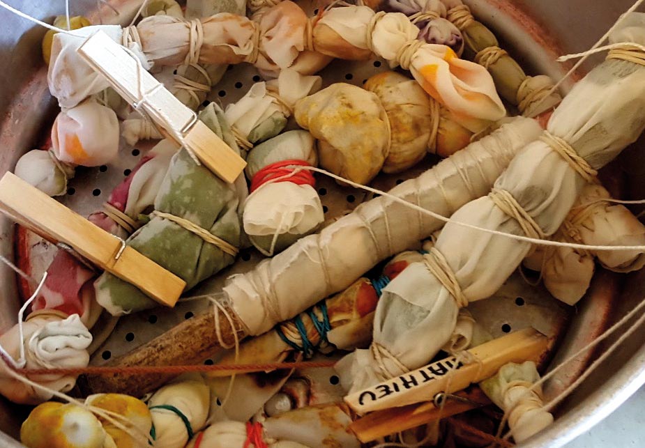 - Après une petite récolte de plantes locales, préparation des bains nécessaires pour la teinture. la teinture aura lieu. Les bains usagés feront l’objet d’un recyclage dédié à l’extraction des pigments..